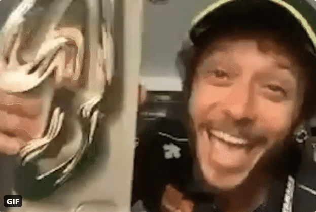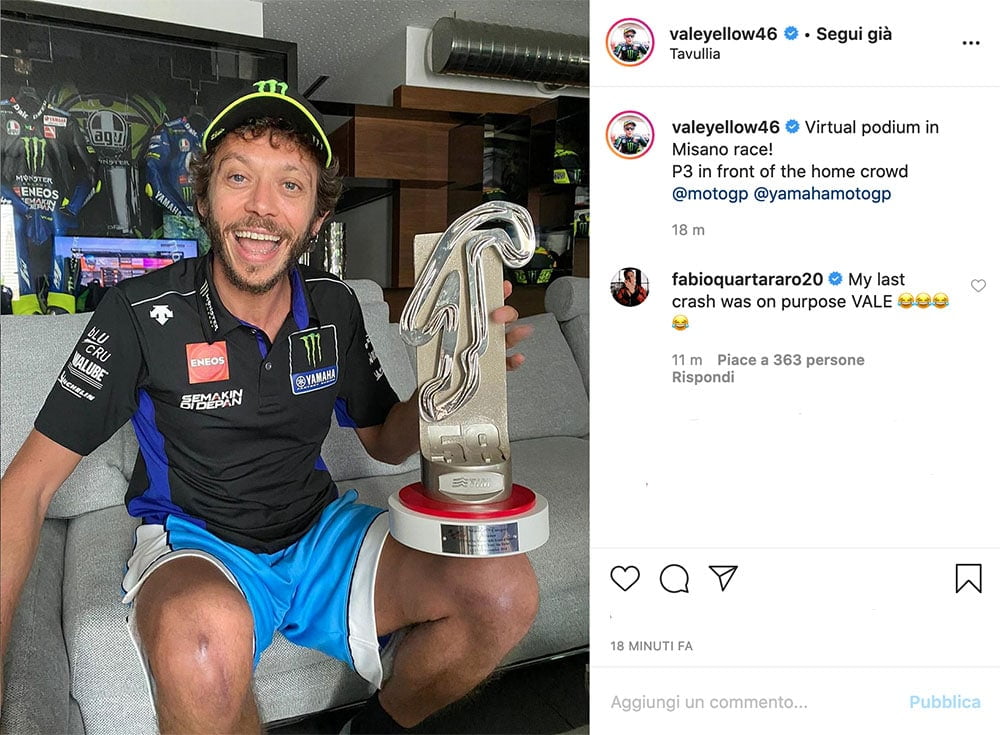 Un cadeau que Valentino Rossi acceptait à vrai dire bien volontiers. « Je suis absolument ravi, c’est un magnifique résultat pour mon épreuve à domicile ! Je dédie ce trophée à mon team et à tous mes fans, » déclarait-il, en brandissant une coupe saisie dans son salon.