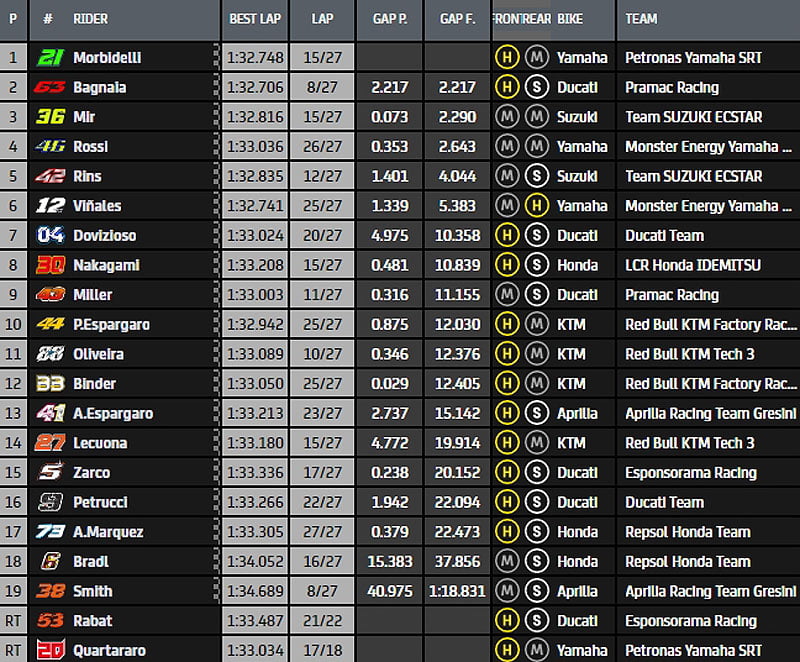 Le top 5 est le suivant à 13 tours du but: Morbidelli, Rossi, Rins, Bagnaia et Miller. Derrière, Mir, Vinales, Dovizioso, Nakagami et Zarco font partie du top10. Les KTM sont hors du top10 avec P Espargaro qui est 11e, Oliveira 12e et Binder 13e