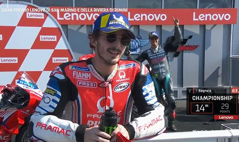 A peine descendu de sa Ducati GP20 satellite du team Pramac après avoir obtenu la deuxième place lors du Grand Prix de Saint-Marin à Misano, Francesco Bagnaia s’est confié devant la caméra du site MotoGP.com avec la joie d’avoir frappé un grand coup pour son retour après sa fracture du tibia, en obtenant son premier podium en catégorie reine…