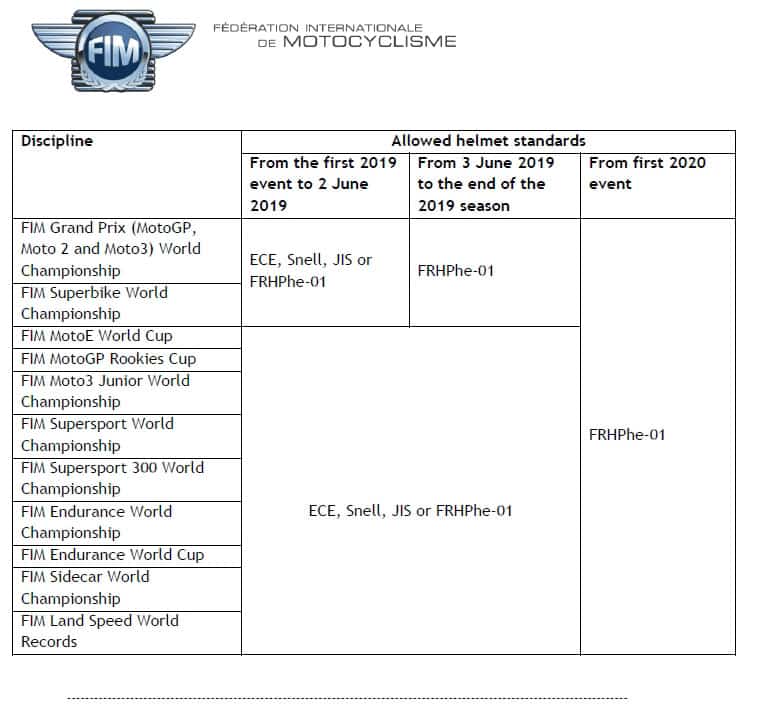 La Commission du Grand Prix, composée de Messieurs Carmelo Ezpeleta (Dorna, Président), Paul Duparc (FIM), Hervé Poncharal (IRTA) & Takanao Tsubouchi (MSMA), et la Commission SBK composée de MM. Gregorio Lavilla (Dorna, Président), Franck Vayssié (FIM) & Takanao Tsubouchi (MSMA), lors des réunions électroniques du 5 février 2019, ont décidé de rendre obligatoire l’utilisation des casques homologués FIM par les coureurs dans tous les Grands Prix et Championnats du Monde SBK à partir du 3 juin 2019 plutôt que lors des premiers événements de la saison 2019 comme annoncé précédemment.