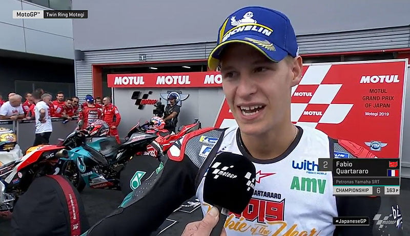 A peine descendu de sa Yamaha M1 du team satellite Petronas Yamaha SRT après avoir obtenu la 2e place du Grand Prix du Japon après avoir donné son maximum sans la moindre erreur, Fabio Quartararo s’est confié devant la caméra du site MotoGP.com avec la joie d’avoir atteint son objectif de début d’année, le titre de Rookie of the Year...