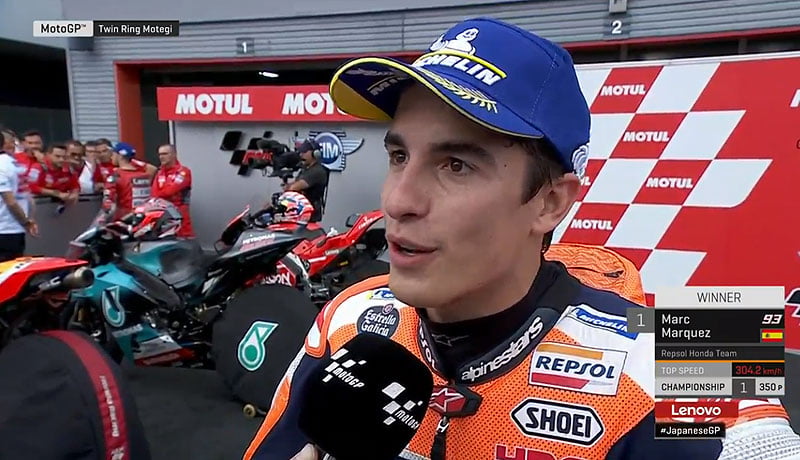 A peine descendu de sa Honda RC213V officielle après avoir remporté le Grand Prix MotoGP du Japon, Marc Márquez s’est confié devant la caméra du site MotoGP.com avec le soulagement d’avoir utilisé jusqu’à sa dernière goutte d’essence…