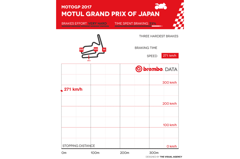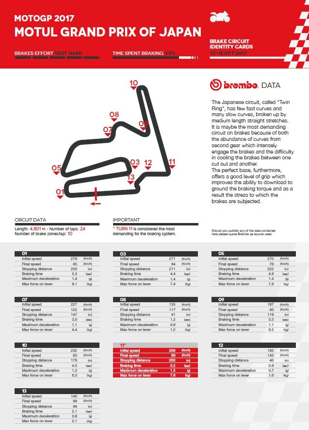Sur les 14 courbes que comporte le tracé nippon, 11 d’entre elles nécessitent l’usage des freins, mais c’est le virage #11 qui le plus exigeant, avec un freinage faisant passer les MotoGP de 308 à 86 km/h en 5,2 secondes; le tout en 263 mètres avec une force atteignant 7,6 kilos sur le levier !