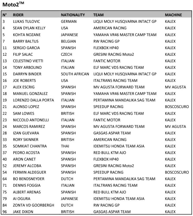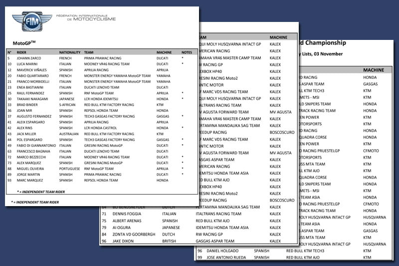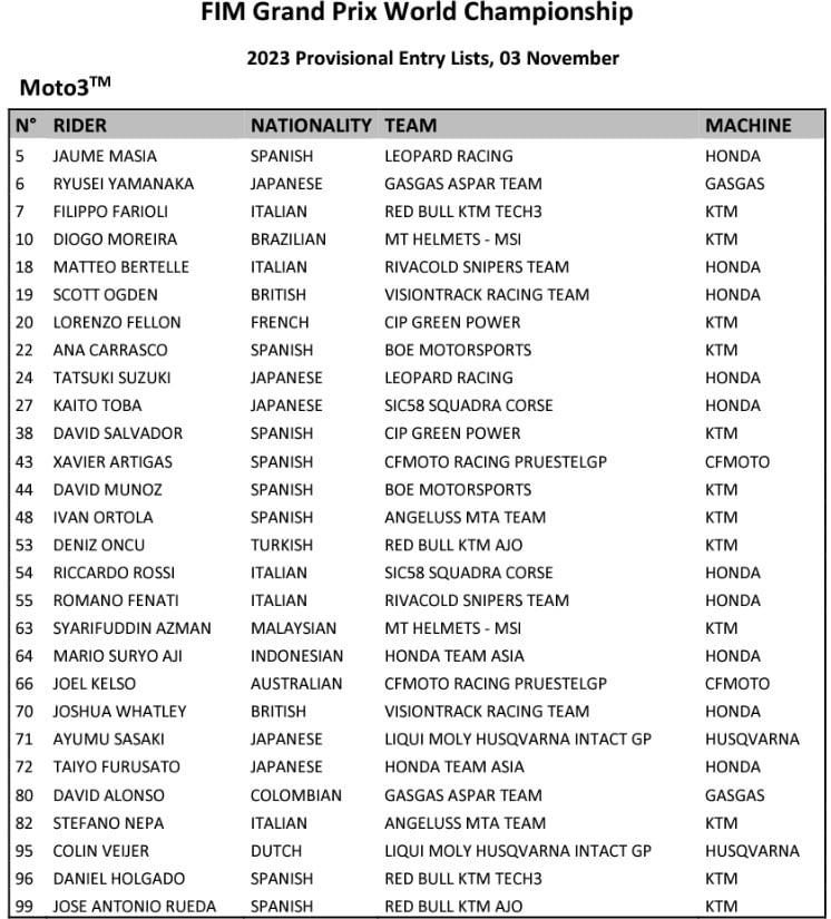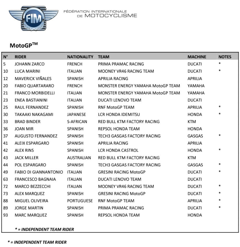 Les Listes d’Engagement provisoires pour le Championnat du Monde FIM MotoGP™ 2023 peuvent maintenant être annoncées, ce jeudi, 03 Novembre 2022.