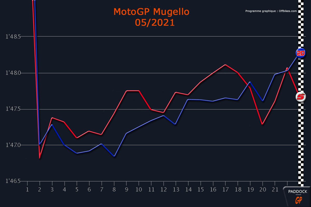Au contraire, une fois en tête Fabio Quartararo a accéléré son rythme pour réaliser son meilleur chrono au huitième tour, en 1’46.836. El Diablo s’est ensuite adapté à la dégradation de ses pneumatiques avant de réaliser une série de chronos, entre le 14e et le 18e tour, très impressionnante de stabilité avec une amplitude maximale de 43 millièmes de seconde sur 5 tours !