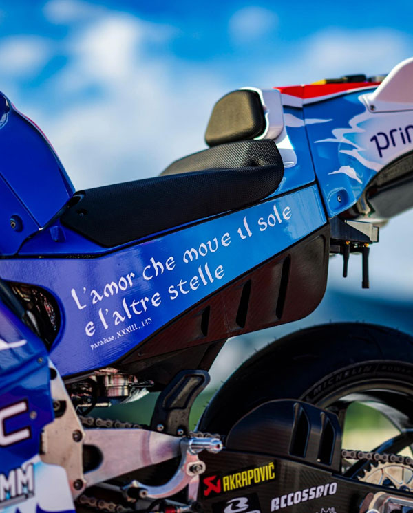 Pour rendre hommage à l’œuvre de Dante, un natif de Florence située à 40 kilomètres du Mugello, le team Pramac Racing a dévoilé en fin d’après-midi les livrées des Ducati Desmosedici GP23 de Jorge Martín et Johann Zarco.