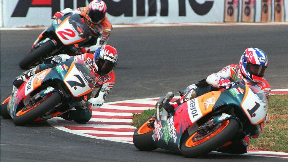 Le jeune Valentino Rossi, tout juste champion du monde, prend les commandes de la course 125cc, tandis que son rival de toujours Max Biaggi s’impose en 250cc. Notons la belle 3e place de notre Olivier Jacque national durant cette course. Coup de tonnerre en 500cc ! Mick Doohan, sur une série de 10 victoires consécutives, se laisse cueillir par Tadayuki Okada sur la ligne pour moins d’un dixième. Pas de mal, il était déjà titré à quatre courses de la fin. Du Doohan dans le texte.