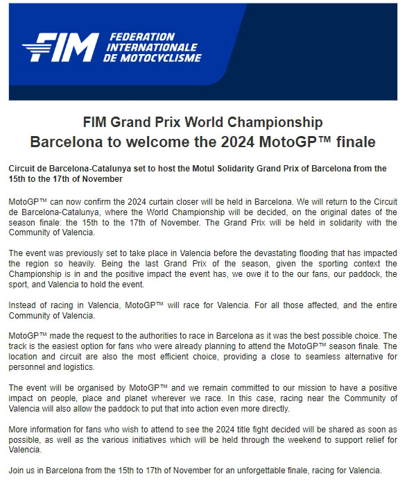Le Grand Prix sera organisé en solidarité avec la Communauté de Valence, sur le Circuit de Barcelona-Catalunya, qui s’apprête à accueillir le Motul Solidarity Grand Prix de Barcelone aux dates initiales du 15 au 17 novembre.