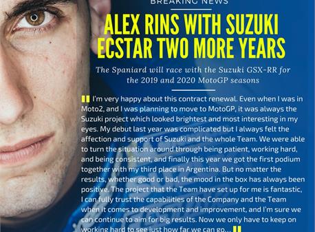 Shinichi Sahara le Project Leader et Davide Brivio le Team Manager sont aux anges. Quant à Alex Rins, il déclare : « je suis très heureux du renouvellement de mon contrat. Lorsque j’étais en Moto2, le projet Suzuki était déjà ma priorité dans mon ambition MotoGP. J’ai été blessé lors de mes débuts avec eux, mais ils m’ont toujours soutenu. Nous avons travaillé dur, ce qui nous amène à cette saison, déjà marquée par un podium en Argentine. L’ambiance au sein de l’équipe a toujours été positive. J’ai confiance en eux et je suis certain que nous allons avancer vers de grands résultats. Il nous faut continuer ainsi et voir jusqu’où cela va nous mener ».