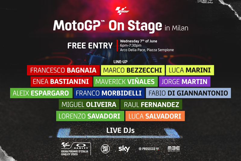 En partenariat avec l’emblématique station italienne Radio Deejay, MotoGP™ On Stage in Milan se déroulera à l’Arco della Pace le mercredi 7 juin. De 18h00 à 19h30, un spectacle en direct illuminera la Piazza Sempione, apportant le meilleur de la musique, du talent et des vibrations du registre de Radio Deejay sur la scène, rejoint par une foule de pilotes et de machines MotoGP™.