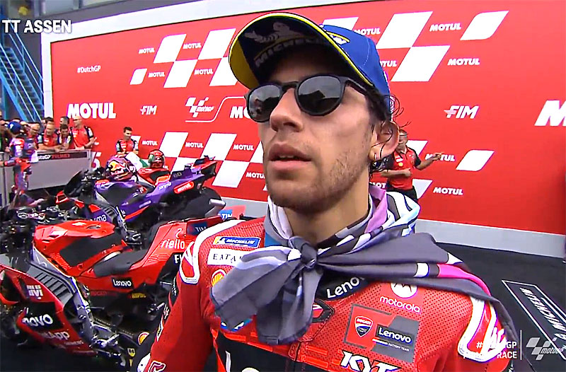 A peine descendu de sa Ducati GP24 officielle après avoir terminé 3e du Grand Prix des Pays-Bas MotoGP 2024 au TT Assen, Enea Bastianini s’est confié devant les caméras du site officiel MotoGP.com avec la joie d’être revenu de loin…