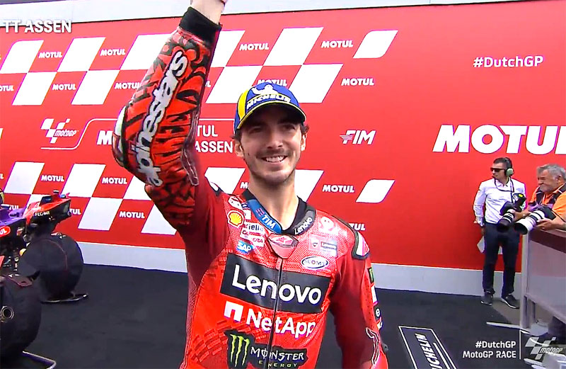 A peine descendu de sa Ducati GP24 officielle après avoir remporté le Grand Prix des Pays-Bas MotoGP 2024 au TT Assen, Francesco Bagnaia s’est confié devant les caméras du site officiel MotoGP.com avec toujours le bonheur d’un homme heureux qui apprécie particulièrement ce parfait week-end en Hollande…