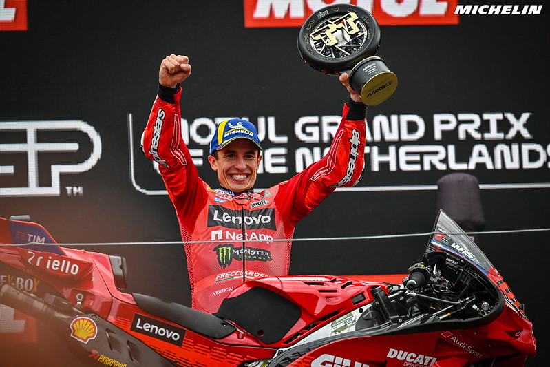 « Oui, ce fut un week-end inattendu, surtout ici en Hollande, à Assen. On dirait que cette année, nous gagnons sur les circuits les plus difficiles pour nous et que nous commettons des erreurs sur nos circuits préférés. Mais à part ça, je suis super content parce que je crois sincèrement qu’aujourd’hui, une fois de plus, je n’étais pas le plus rapide, mais j’ai réussi à gérer la course comme je l’ai fait pour gagner. Et oui, je suis très heureux parce que le week-end a commencé de manière très difficile. Je ne suis pas satisfait à 100 % car mon père vient de m’annoncer qu’Alex s’est blessé, je crois à un doigt. Mais j’ai battu tous mes adversaires, en particulier mon principal rival, Alex, qui pilotait très bien et qui est mon frère. Nous allons donc essayer de l’aider à revenir le plus vite possible et au même niveau, car il pilote cette Ducati Gresini de manière incroyable. »
