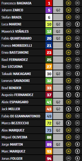 Ce matin, Marco Bezzecchi, Maverick Vinales, Alex Márquez, Johann Zarco, Fabio Quartararo, Luca Marini, Takaaki Nakagami, Jorge Martin, Jack Miller et Aleix Espargaro se sont provisoirement pré-qualifiés pour la Q2, ce qui n’est pas le cas de Francesco Bagnaia que l’on a vu s’énerver à plusieurs reprises dans son box.