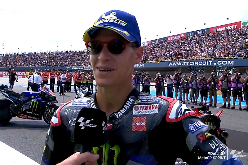 A peine descendu de sa Yamaha YZR-M1 officielle après avoir terminé 3e du Sprint du Grand Prix des Pays-Bas à Assen, Fabio Quartararo s’est confié devant les caméras du site officiel MotoGP.com avec la satisfaction de monter à nouveau sur un podium, même si c’est en bénéficiant de la pénalité infligée à Brad Binder pour être sorti des limites de la piste…