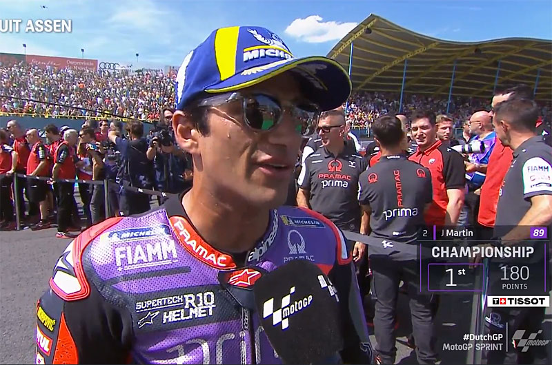 Jorge Martin : « Oui. Vous savez, après la journée d’hier, je ne m’attendais pas à être sur le podium aujourd’hui. Je pense que nous avons beaucoup travaillé hier et aujourd’hui pour essayer de comprendre, mais Pecco est toujours sur une autre planète. J’ai essayé de le suivre, mais j’ai eu beaucoup de mal avec le pneu avant dur. J’ai senti qu’il fallait le forcer, mais finalement je l’ai forcé, mais la sensation n’était pas bonne. Mais quoi qu’il en soit, je suis vraiment heureux d’être ici à Assen, dans la cathédrale, sur le podium. Merci aux fans, parce que c’est incroyable comme ils encouragent, et j’espère que demain je pourrai être sur le podium ».