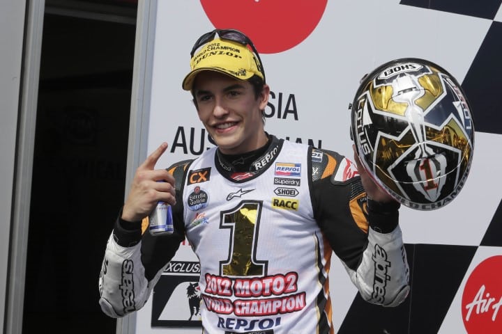 En 2012, avec plus d’expérience, il a battu son grand rival Pol Espargaró avec la Kalex, la moto championne de l’année précédente. Marc a remporté la couronne Moto2 avec 137 points d’avance sur la deuxième Suter, celle de Tom Luthi, qui était 4ème au classement final. Il était déjà prêt à faire le saut en MotoGP dans la meilleure équipe de l’histoire de la catégorie reine, Repsol Honda.