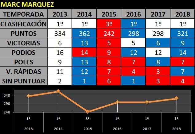 Durant les premières années avec Dani Pedrosa dans le box, il est devenu évident que Marc savait apprendre et tirer profit des qualités techniques de son coéquipier, pour ensuite les mettre en pratique sur la piste comme lui seul sait le faire. Aujourd’hui, à 26 ans et en pleine maturité sportive, nous nous retrouvons avec un pilote inatteignable… Quelqu’un sait-il dire son point faible ? Tant qu’il ne chute pas, et il le fait de moins en moins, il ne peut être battu dans le classement par points après 19 courses. Le sentiment est que seule une blessure l’empêcherait de remporter son 8ème titre mondial en 2019. Depuis qu’il est en MotoGP, il n’a perdu qu’un seul titre, le titre 2015, où Jorge Lorenzo et Valentino Rossi ont terminé devant lui mais avec une marque différente, Yamaha.