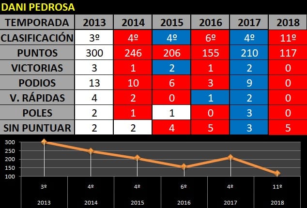 La dernière tension entre les deux s’est produite à Aragón, où Marc Márquez a touché Pedrosa, provoquant une coupure dans le câble du capteur de vitesse de roue arrière de la RC213V. Celui de Castellar del Vallés se retrouvait au sol et celui de Cervera au sommet. Ce fut un anniversaire difficile pour Pedrosa, poursuivi par la malchance, qui allait devenir le pilote n°2 de Honda jusqu’à son  départ de l’équipe. Comparons les chiffres des deux durant les 6 saisons où ils ont partagé le box: Marc Márquez a toujours terminé devant la vraie légende qu’était Dani Pedrosa.