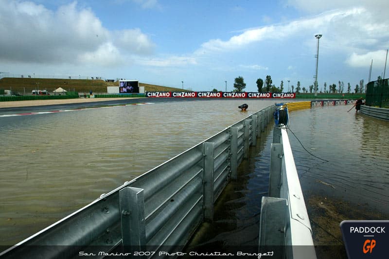 Misano 2007, vendredi après-midi : Le ciel menaçant vire au noir et un violent orage comme on peut en avoir en fin d’été éclate.