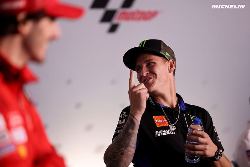 Fabio Quartararo : « Pour être honnête, je pense que je suis également impatient, mais ce n’est pas quelque chose qui m’obsède. Ici, je veux prendre du plaisir. Cette année, nous avons remporté le championnat mais je n’ai pas besoin d’être obsédé : Si nous nous battons avec Pecco, nous nous battons avec Pecco. S’il gagne ou que je gagne, c’est OK, mais plus que de combattre, je veux simplement piloter libéré et me battre jusqu’à la fin. Mais bien sûr, ce serait bien une bagarre avec Pecco. »