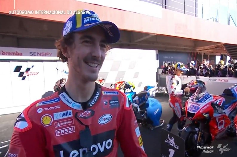 A peine descendu de sa machine après avoir obtenu la pole position à l’issue des qualifications du Grand Prix d’Algarve, Pecco Bagnaia s’est confié devant la caméra du site officiel MotoGP.com.