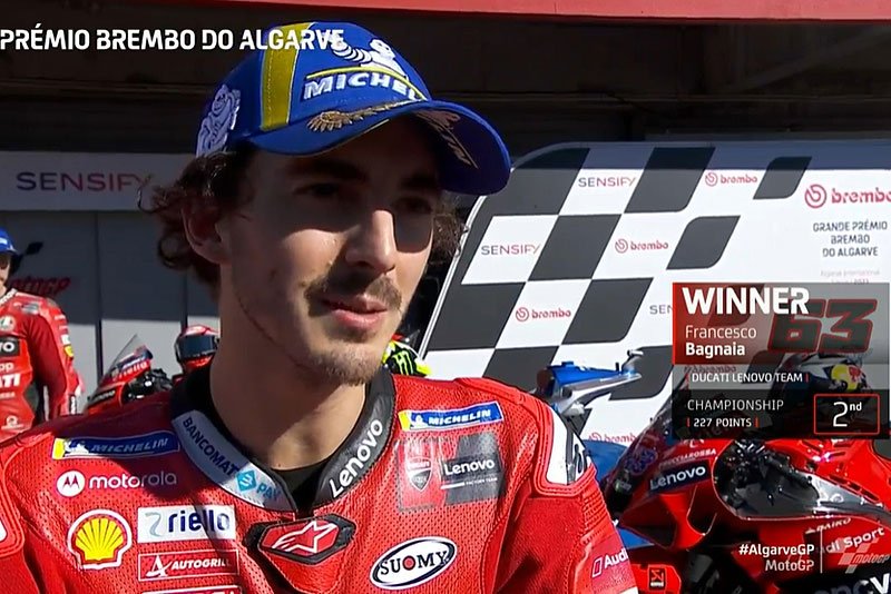 A peine descendu de sa machine après avoir remporté le Grand Prix d’Algarve, Pecco Bagnaia s’est confié devant la caméra du site officiel MotoGP.com.