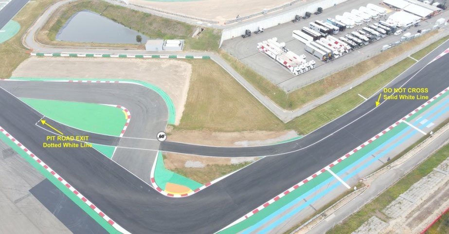 Les coureurs qui prennent le départ de la course depuis la voie des stands DOIVENT prendre le virage 1 de la manière habituelle, et NON par la voie de sortie des stands.