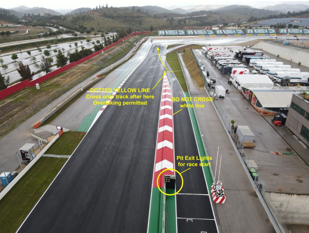 Le Règlement de la FIM (Art. 1.21.16) autorise les essais de départ depuis la sortie de la voie des stands pendant les séances lorsqu’il est possible de le faire en toute sécurité.