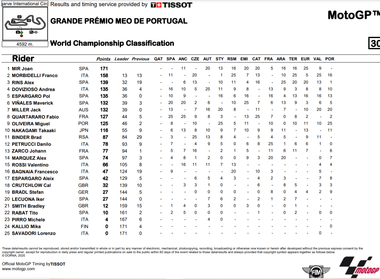 MotoGP Portimao Championnat : classement final après Portimao (14/14)