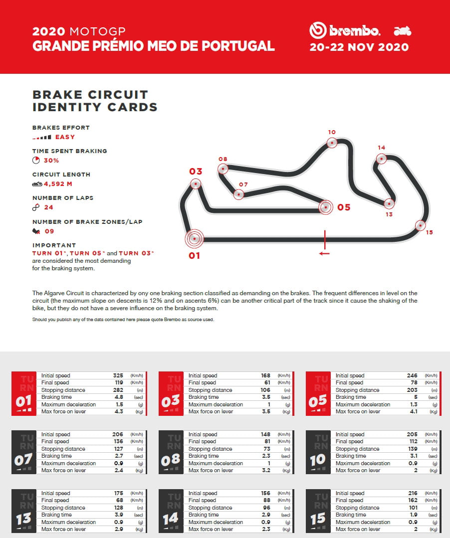 Selon les techniciens de Brembo, qui travaillent en étroite collaboration avec tous les pilotes du championnat du monde MotoGP, le circuit international de l’Algarve est l’un des circuits les moins exigeants en matière de freins. Sur une échelle de 1 à 5, il a obtenu un 2 sur l’indice de difficulté, le plus bas du championnat 2020.