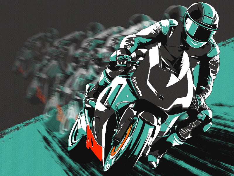 Cependant, cinq fois par tour, le freinage en MotoGP entraîne une chute de vitesse inférieure à 100 km/h et donc une utilisation des freins inférieure de 3,2 secondes. À l’exception de quelques virages, la décélération moyenne ne dépasse pas 1 g. Par conséquent, du départ au drapeau à damier, la charge totale sur le levier de frein n’atteint pas 650 kg.
