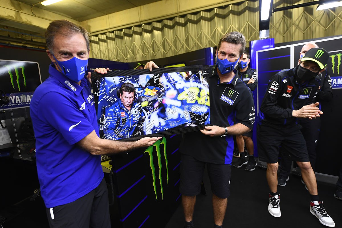 Le team MotoGP Yamaha Factory Racing ne pouvait pas laisser passer cette occasion sans la saisir. Le jeudi 19 novembre, l’ensemble du personnel (y compris le personnel et les amis du team qui ne sont pas au Portugal, mais qui ont assisté à l’événement en ligne) s’est réuni dans le garage MotoGP de Monster Energy Yamaha pour donner aux membres qui partaient la reconnaissance qu’ils méritent et leur offrir quelques cadeaux d’adieu.
