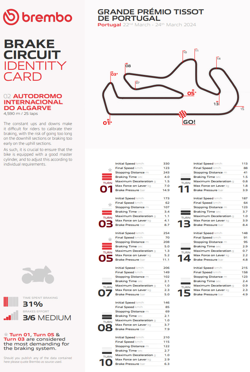 Selon les techniciens Brembo qui travaillent en étroite collaboration avec tous les pilotes de MotoGP, l’Autódromo Internacional do Algarve, d’une longueur de 4,59 km, appartient à la catégorie des circuits modérément exigeants pour les freins. Sur une échelle de 1 à 6, il a obtenu un indice de difficulté de 3, car la moitié des 10 points de freinage appartiennent à la catégorie Faible et seulement 2 à la catégorie Élevée. De plus, ces 2 derniers sont tous contenus dans les 5 premiers virages, ce qui facilite le retour du système à des températures acceptables dans les autres virages.