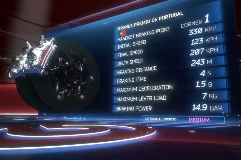 Le virage le plus difficile de l’Autódromo Internacional do Algarve pour le système de freinage est le premier, grâce à la ligne droite de 969 mètres qui le précède : en utilisant les freins pendant 4 secondes, les pilotes de MotoGP parviennent à réduire leur vitesse de 330 km/h à 123 km/h en parcourant 243 mètres. Pour y parvenir, ils exercent une charge de 7 kg sur le levier de frein tandis que la pression du liquide de frein Brembo atteint 14,9 bars.