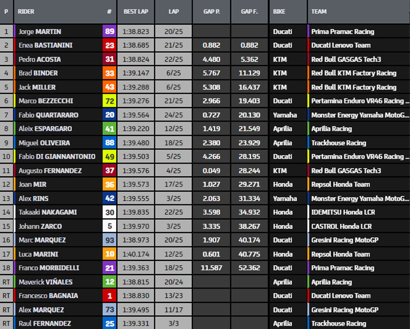 Martin se maintient en leader devant Vinales. 0.439s séparent les 2 pilotes. Bastianini, Bagnaia, et Acosta ferment la marche de ce top5.