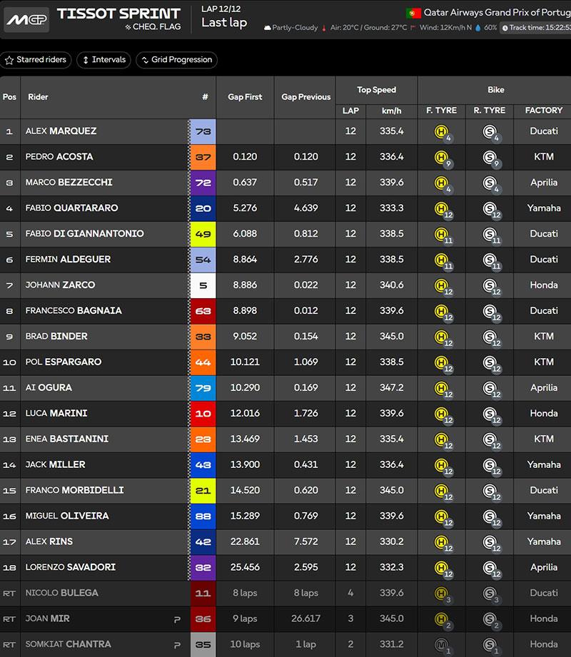 Les deux premières places au championnat sont verrouillées, mais Bezzecchi (3e) creuse l’écart à +10 points sur Bagnaia (4e). Acosta (5e) est à -29 de « Bez ». La chasse est ouverte ! Le Sprint est bouclé, mais Portimão bout encore : Alex Marquez en conquérant, Acosta en menace, Bezzecchi est en embuscade Quartararo en héros. Cette course promet et la voici !