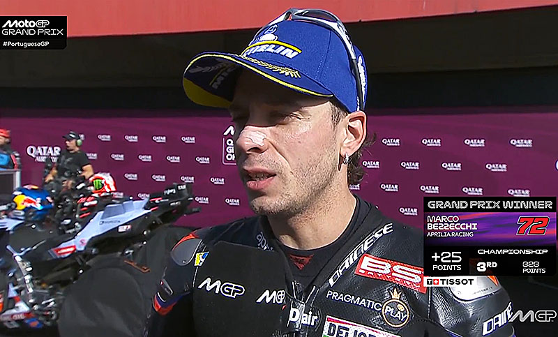 À peine descendu de son Aprilia RS-GP du team d’usine Aprilia Racing après avoir remporté la course du Grand Prix du Portugal 2025 à Portimão, le poleman Marco Bezzecchi s’est confié devant les caméras du site officiel MotoGP.com avec la joie d’inscrire sa 2e victoire de la saison, sa 5e en catégorie reine…
