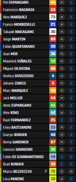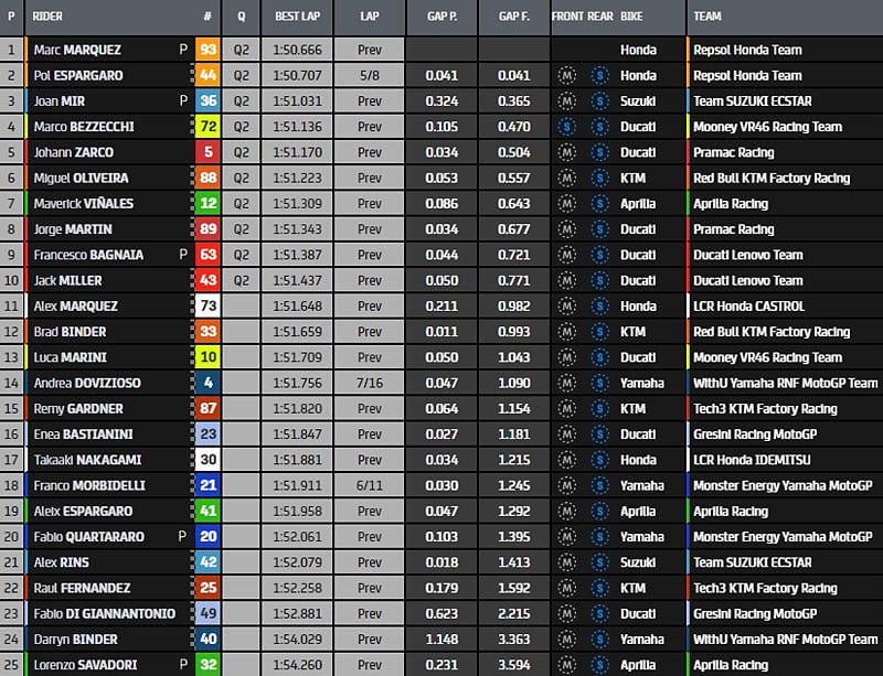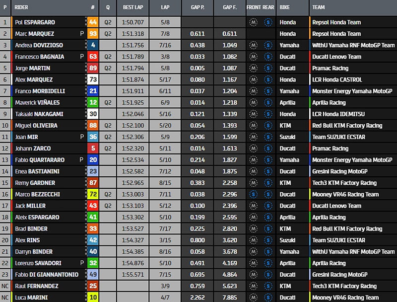 À la mi-séance, alors que seul Alex Rins est encore en piste, alors que sont provisoirement préqualifiés Marc Márquez, Pol Espargaro, Joan Mir, Marco Bezzecchi, Johann Zarco, Miguel Oliveira, Maverick Vinales, Jorge Martin, Francesco Bagnaia et Jack Miller.