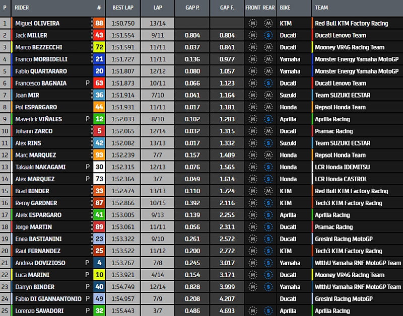 Comme quoi on n’est pas au bout des surprises dans ce championnat ouvert comme jamais ! Au final, Miguel Oliveira, Joan Mir, Fabio Quartararo, Brad Binder, Marc Márquez, Pol Espargaró, Marco Bezzecchi, Johann Zarco, Aleix Espargaró et Jack Miller sont donc pré-qualifies pour la Q2, ce qui implique que Maverick Viñales, Jorge Martín, Francesco Bagnaia et surtout Enea Bastianini et Álex Rins, respectivement premier et deuxième du championnat, vont devoir particulièrement soigner cette FP4 de 30 minutes pour préparer la Qualification 1 !