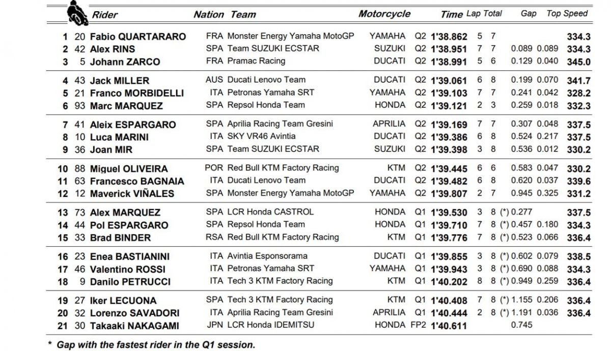 L’ancien champion du monde de Moto2 commente ainsi : « il semble que nous ayons réussi à résoudre les problèmes du Qatar, sans trop vouloir entrer dans le fond de ce qui s’est passé à Losail. En fait, j’ai préféré ne pas trop enquêter sur les difficultés des deux premières courses ». Le triple vainqueur en MotoGP ajoute : « je dois être heureux de cette position en qualifications, et d’abord pour avoir trouvé les sensations que je voulais avec la M1. En fait, j’ai réussi à être rapide, surtout sur un tour chrono, où j’ai retrouvé une excellente confiance ».