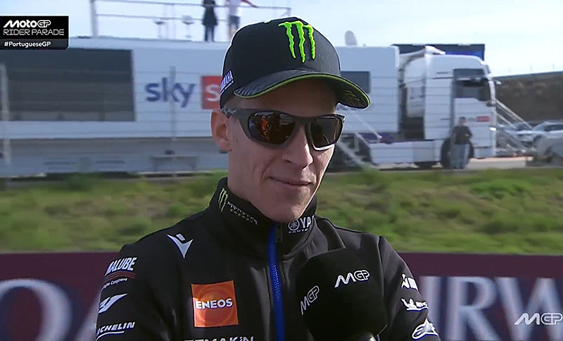 Fabio Quartararo : « Non, non, en réalité, c’était même mieux que prévu. Vous savez, notre rythme n’était pas extraordinaire, mais nous avons pu garder la quatrième position. Aujourd’hui, ce sera plus difficile, car nous n’avons pas d’adhérence avec le pneu medium. Donc on va faire de notre mieux, et ensuite, eh bien, ce sera la dernière. »