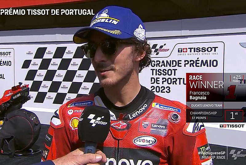 A peine descendu de sa Ducati GP23 officielle après avoir remporté le Grand Prix du Portugal sur le circuit de Portimão, Francesco Bagnaia s’est confié devant les caméras du site officiel MotoGP.com avec la satisfaction de poursuivre sa domination actuelle mais le regret de l’absence de sa fiancée…