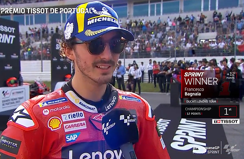 A peine descendu de sa Ducati GP23 officielle après avoir remporté le premier Sprint de l’histoire du MotoGP sur le circuit de Portimão au Portugal, Francesco Bagnaia s’est confié devant les caméras du site officiel MotoGP.com avec la joie d’avoir pris beaucoup de plaisir…