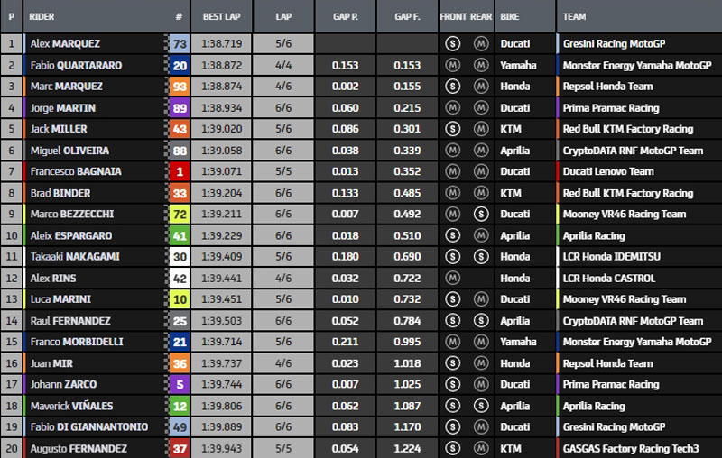 Au troisième tour lancé, c’est Marc Márquez qui impose un 1’38.874 devant son frère pendant que Francesco Bagnaia préfère faire un entraînement de changement de motos en cas de course flag to flag peu probable.