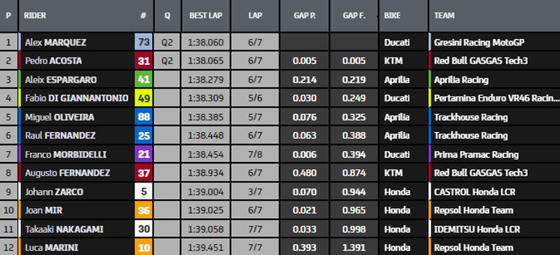 Résultats de la qualification-2 du Grand Prix du Portugal sur l’Autodrome International de l’Algarve à Portimão :