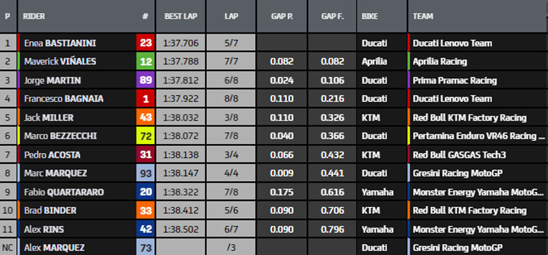 Enea Bastianini : « Oui, après une longue période sans cette pole position, c’est spécial aujourd’hui, et c’est la première avec Ducati. Tiens, les MotoE, le son n’est pas mal (rires). Je suis heureux parce que depuis hier nous nous sommes améliorés, et aujourd’hui nous étions positifs pour faire une grande qualification, et puis c’est arrivé avec cette pole position. Et rien, c’est seulement la première étape parce qu’aujourd’hui nous avons aussi la course sprint, mais nous sommes heureux. »