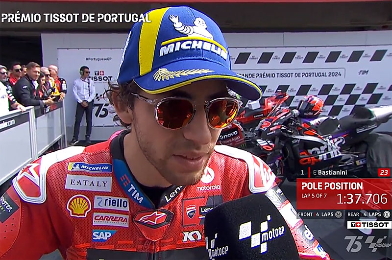 A peine descendu de sa Ducati GP24 officielle après avoir dominé les qualifications du Grand Prix MotoGP du Portugal sur l’Autodrome International de l’Algarve à Portimão, Enea Bastianini s’est confié devant les caméras du site officiel MotoGP.com avec la joie d’avoir obtenu la 2e pole position de sa carrière en catégorie reine, qui plus est à l’endroit même qui l’avait vu gravement se blesser l’an passé…