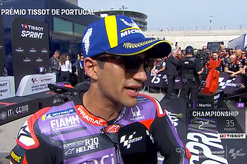 A peine descendu de sa Ducati GP24 du team Pramac après avoir terminé 3e du Sprint du Grand Prix MotoGP du Portugal sur l’Autodrome International de l’Algarve à Portimão, Jorge Martin s’est confié devant les caméras du site officiel MotoGP.com en voyant plutôt le verre à moitié vide qu’à moitié plein…