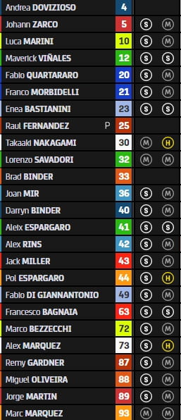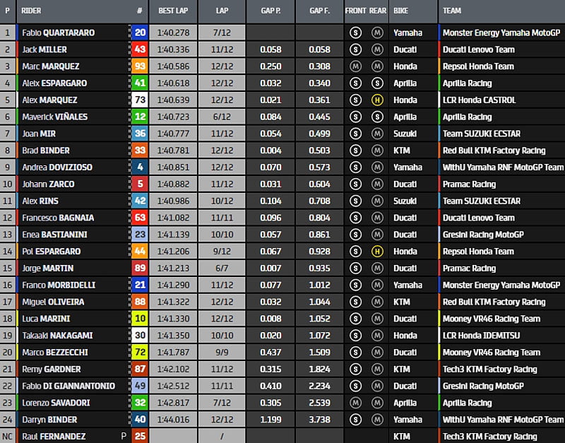 La hiérarchie est alors établie comme suit : Fabio Quartararo, Jack Miller, Maverick Vinales, Joan Mir, Alex Márquez, Alex Rins, Aleix Espargaro, Brad Binder, Jorge Martin et Marc Márquez pour le top 10. Johann Zarco figure en 10e position, Francesco Bagnaia en 14e et Enea Bastianini en 21e.